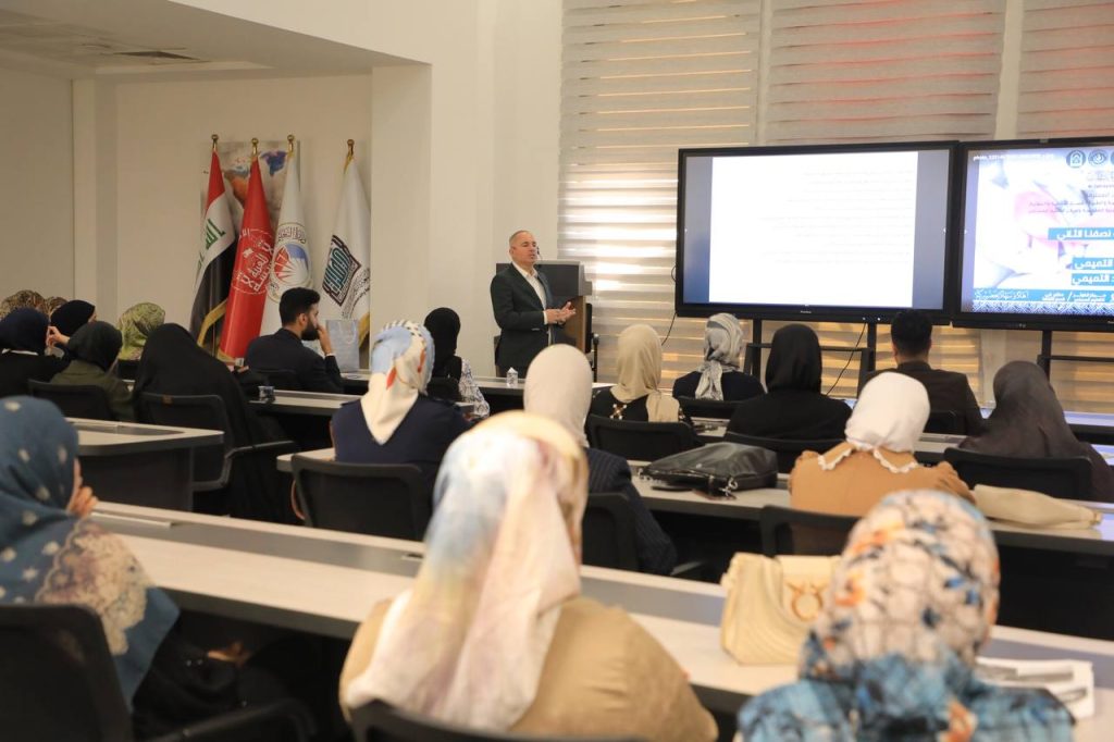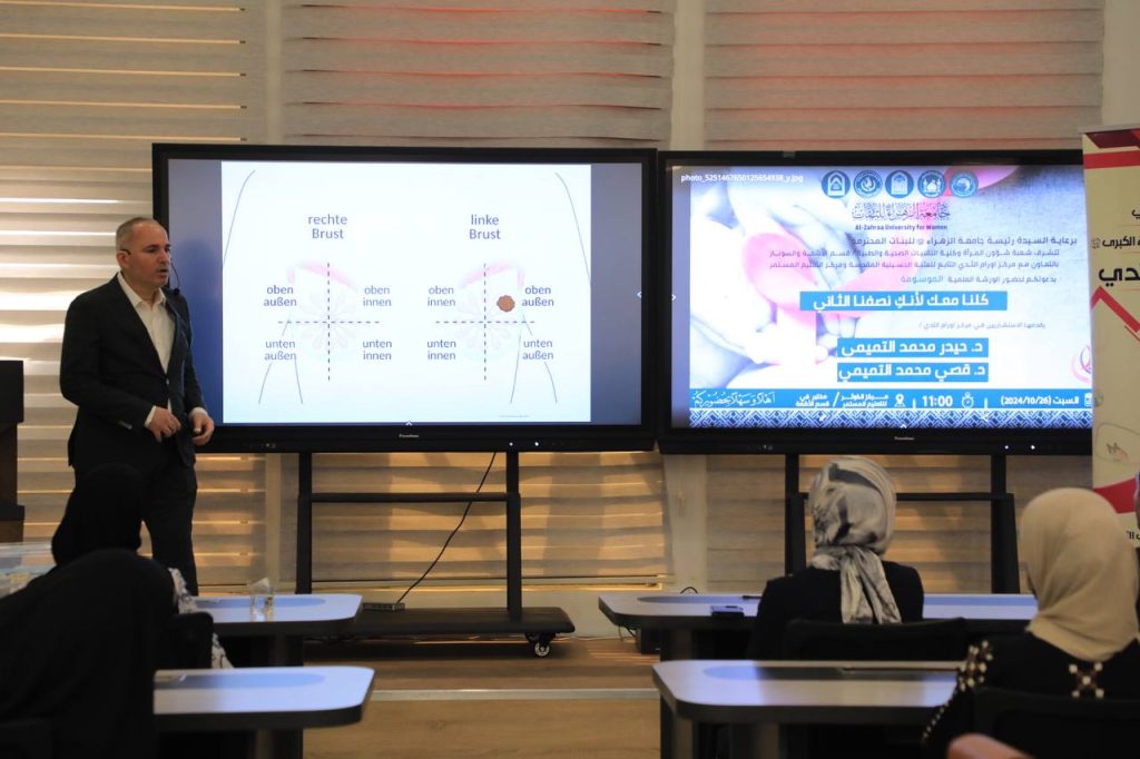 The motto of the workshop was "We are all with you because you are our second half". Furthermore, the said workshop took place on Saturday, October 26, 2024, at 11:00 AM in the sonar laboratory of the Radiology Department at the University. Dr. Haider Muhammad Al-Tamimi, specialized consultant at the Breast Oncology Center, presented the main theme of the workshop.